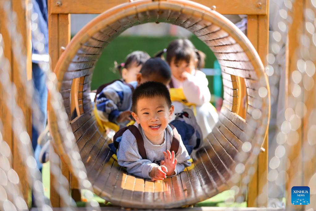 Child have fun at a nursery center in Qingdao City, east China's Shandong Province, Nov. 4, 2025. Shandong Province has rolled out a series of policies such as developing childcare institutions, increasing kindergarten nursery classes, and offering childcare service in communities to promote its inclusive childcare system, with a focus on the caring of children under three years old. (Photo by Zhang Ying/Xinhua)