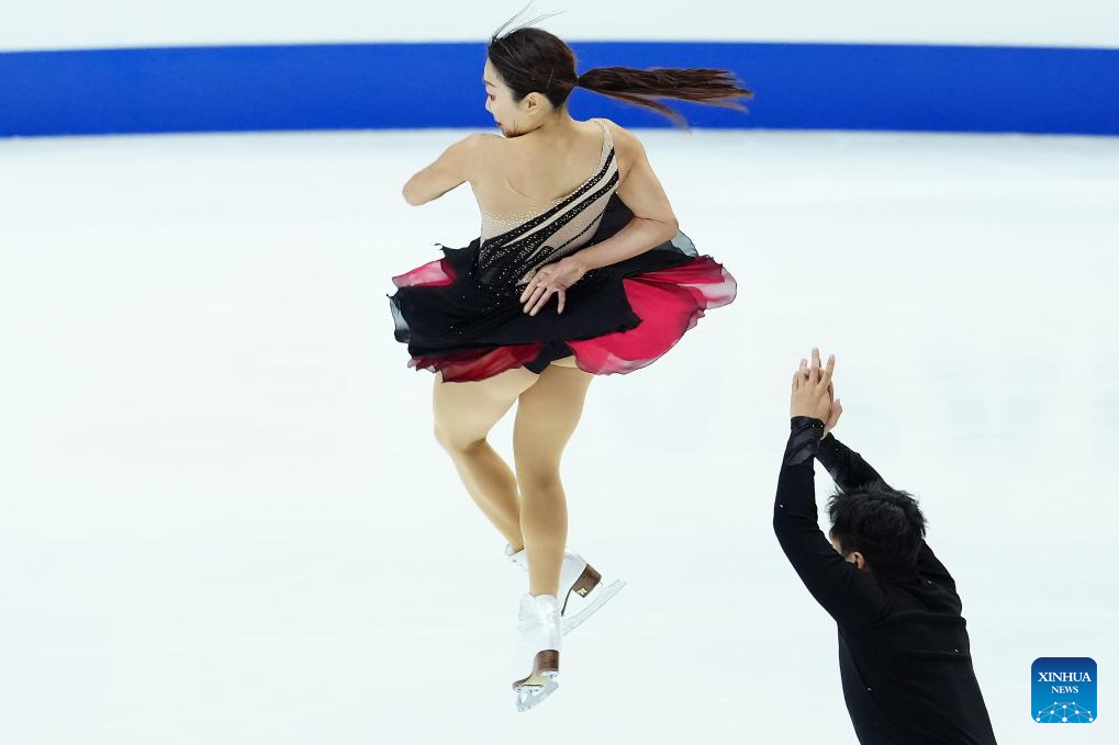 Sui Wenjing (top)/Han Cong of China perform during the pairs skating short program at ISU Figure Skating Grand Prix 2025 in Osaka, Japan, Nov. 7, 2025. (Xinhua/Jia Haocheng)
