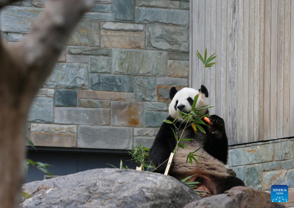 Giant panda Xingqiu eats carrot and bamboo at Adelaide Zoo in Adelaide, Australia, Nov. 10, 2025. The giant panda pair Xingqiu, a male, and Yilan, a female, arrived in Adelaide on Dec. 15, 2024. According to the contract, they will spend ten years at Adelaide Zoo, replacing the pair Wangwang and Funi who returned to China last November after 15 years in Australia. (Xinhua/Ma Ping)