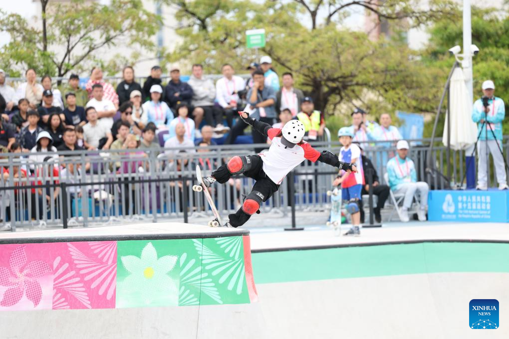 Zheng Haohao of Guangdong competes during the women's park final of skateboarding at China's 15th National Games in Huizhou, south China's Guangdong Province, Nov. 11, 2025. (Xinhua/Lu Hanxin)