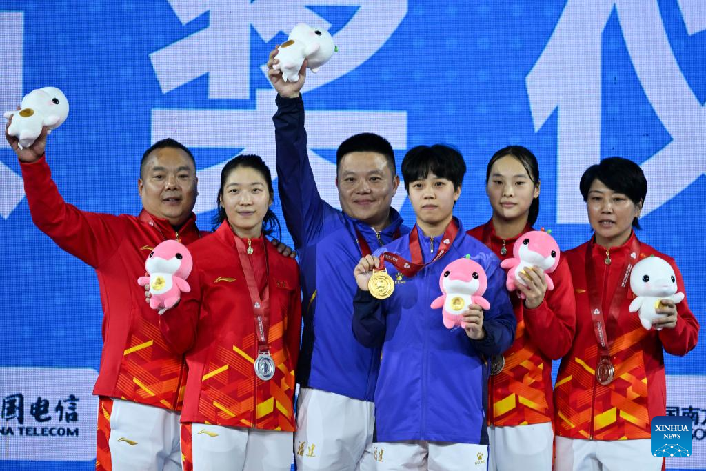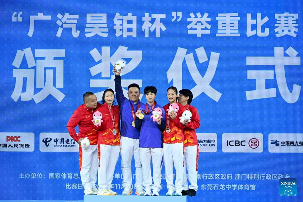 Gold medalist Wei Tingna of Fujian, silver medalist Su Tingting of Chongqing, bronze medalist Liu Mengjia of Chongqing and their coaches pose during the awarding ceremony for the weightlifting women's 55kg at China's 15th National Games in Dongguan, south China's Guangdong Province, Nov. 11, 2025. (Xinhua/Yang Chenguang)