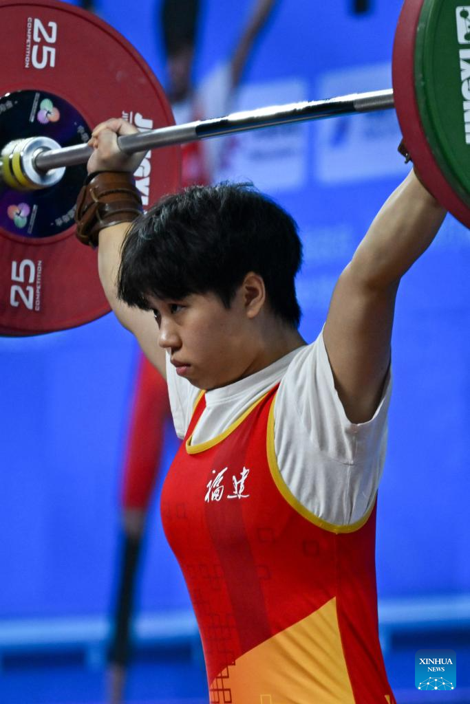 Wei Tingna of Fujian competes in snatch during the weightlifting women's 55kg final at China's 15th National Games in Dongguan, south China's Guangdong Province, Nov. 11, 2025. (Xinhua/Yang Chenguang)