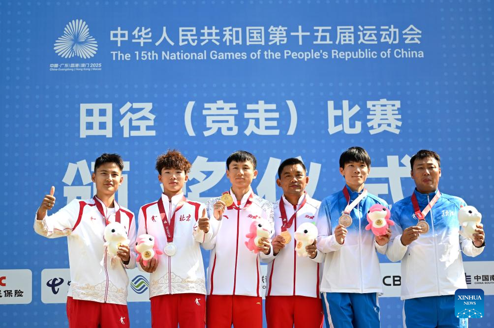 Gold medalist Zhang Jun (3rd L) of Yunnan, silver medalist Shi Shengji (2nd L) of Beijing and bronze medalist Qian Haifeng (2nd R) of Heilongjiang pose with their coaches during the awarding ceremony for the men's 20km race walk of athletics at China's 15th National Games in Zhuhai, south China's Guangdong Province, Nov. 12, 2025. (Xinhua/Zhang Long)