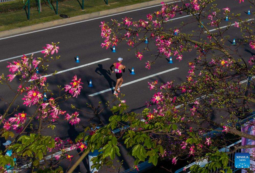 An aerial drone photo taken on Nov. 12, 2025 shows athletes competing during the men's 20km race walk of athletics at China's 15th National Games in Zhuhai, south China's Guangdong Province. (Xinhua/Mao Siqian)