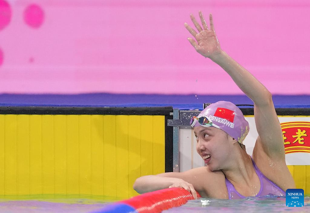 Peng Xuwei of Hubei reacts after the women's 100m backstroke final of swimming at China's 15th National Games in Shenzhen, south China's Guangdong Province, Nov. 12, 2025. (Xinhua/Du Yu)