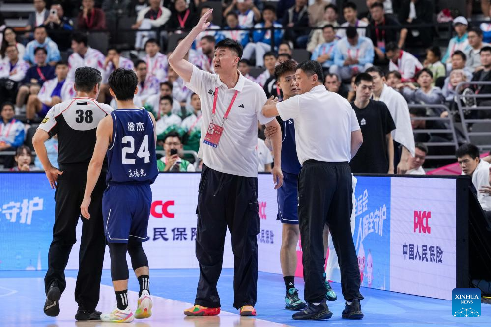 Wu Qian (C) of Zhejiang competes during the men's basketball final between Guangdong and Zhejiang at China's 15th National Games in Qingyuan, south China's Guangdong Province, Nov. 12, 2025. (Xinhua/Li Bo)