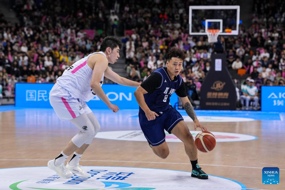 Wang Ruize (top) of Guangdong competes during the men's basketball final between Guangdong and Zhejiang at China's 15th National Games in Qingyuan, south China's Guangdong Province, Nov. 12, 2025. (Xinhua/Li Bo)