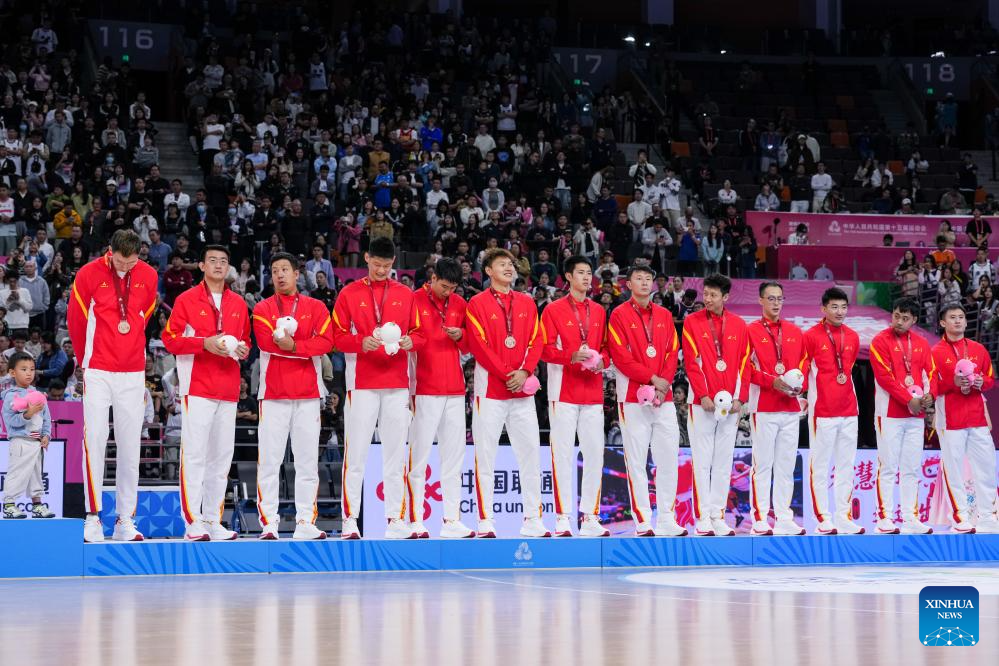Bronze medalist team Sichuan attend the awarding ceremony for men's basketball at China's 15th National Games in Dongguan, south China's Guangdong Province, Nov. 12, 2025. (Xinhua/Li Bo)