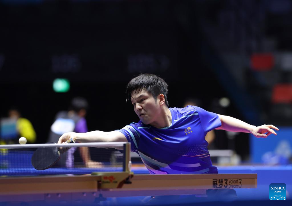 Fan Zhendong hits a return during the table tennis men's singles quarterfinal match between Fan Zhendong of Shanghai and Sun Zheng of Zhejiang at China's 15th National Games in Macao, south China, Nov. 13, 2025. (Xinhua/Liu Xu)