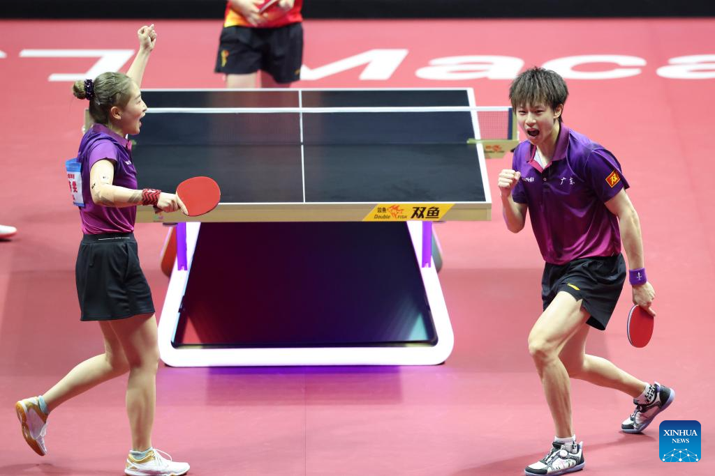 Lin Gaoyuan/Liu Shiwen (L) celebrate after winning the table tennis mixed doubles semifinal match between Lin Gaoyuan/Liu Shiwen of Guangdong and Yuan Licen/Wang Yidi of Liaoning at China's 15th National Games in Macao, south China, Nov. 13, 2025. (Xinhua/Liu Xu)