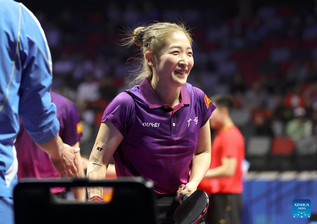 Zhu Yuling celebrates scoring during the table tennis women's singles quarterfinal match between Zhu Yuling of Macao and Chen Xingtong of Liaoning at China's 15th National Games in Macao, south China, Nov. 13, 2025. (Xinhua/Liu Xu)