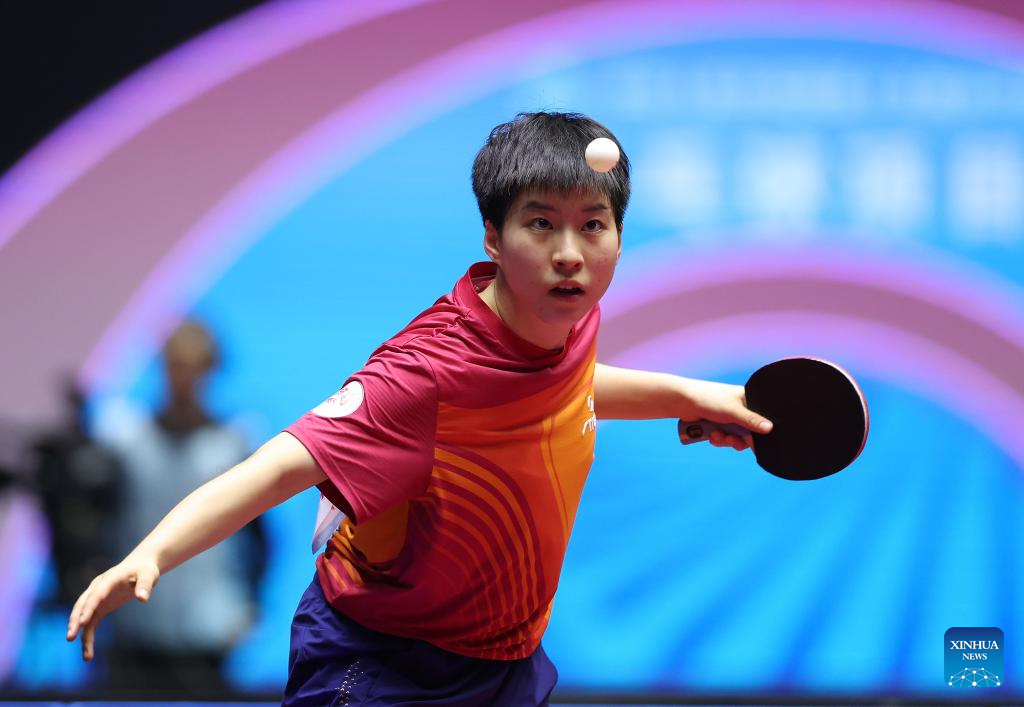 He Zhuojia hits a return during the table tennis women's singles round of 16 match between Chen Meng of Shandong and He Zhuojia of Hebei at China's 15th National Games in Macao, south China, Nov. 12, 2025. (Xinhua/Liu Xu)