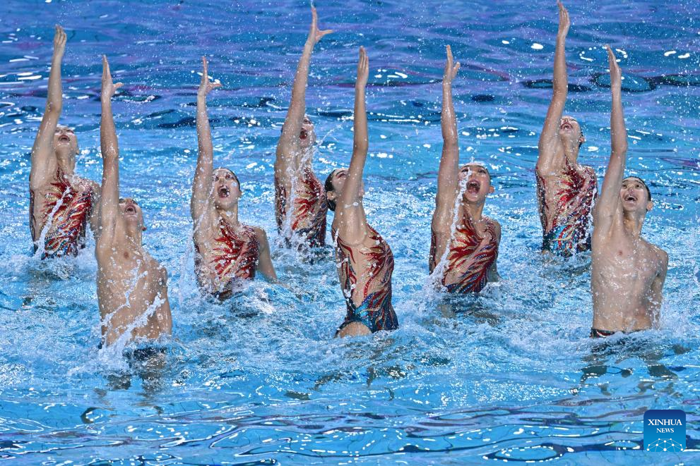 Team Beijing Sport University perform during the team technical of artistic swimming at China's 15th National Games in Jiangmen, south China's Guangdong Province, Nov. 13, 2025. (Xinhua/Chen Zhonghao)