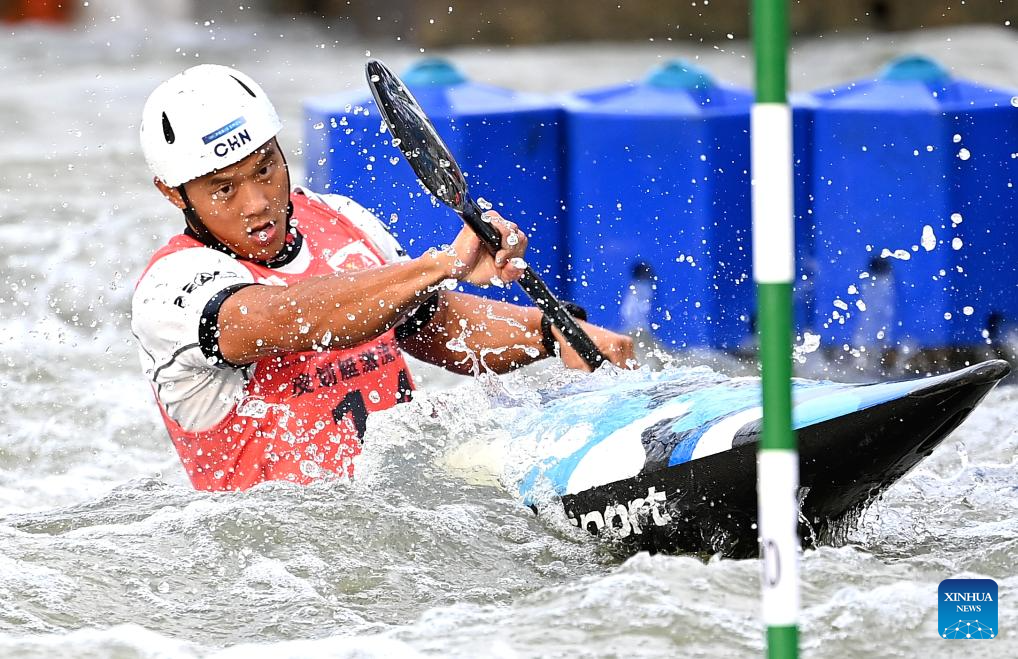 Quan Xin of Fujian competes during the men's kayak single final of canoe slalom at China's 15th National Games in Guangzhou, south China's Guangdong Province, Nov. 13, 2025. (Xinhua/Tang Yi)