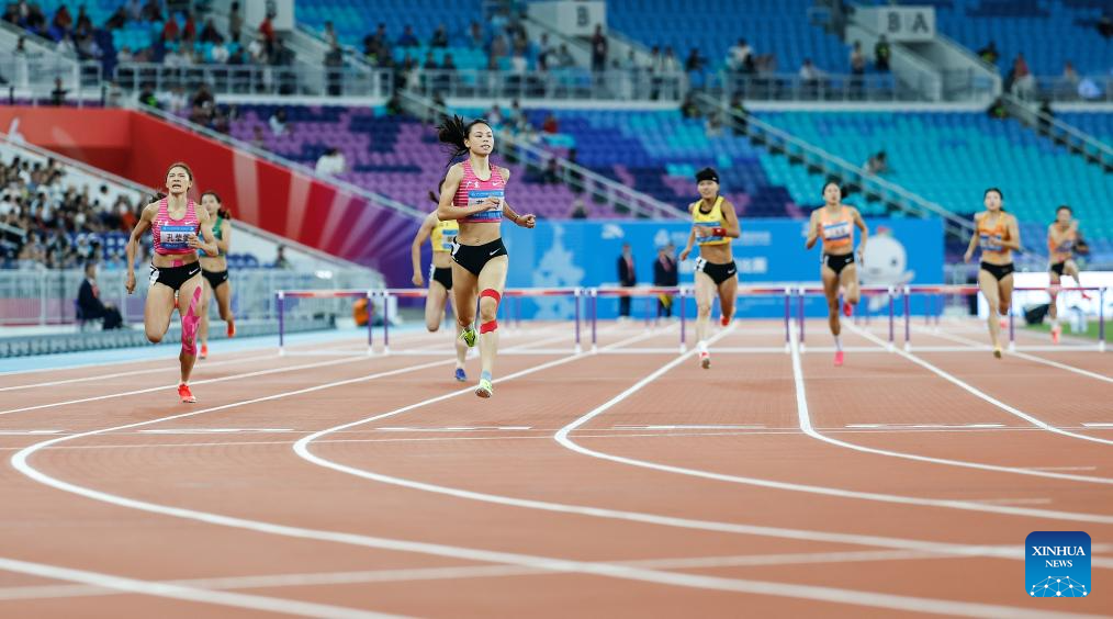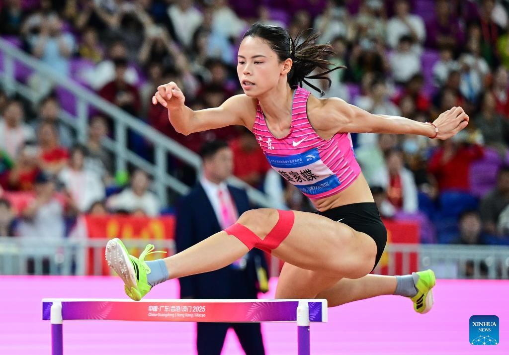 Mo Jiadie of Guangdong competes during the women's 400m hurdles final of athletics at China's 15th National Games in Guangzhou, south China's Guangdong Province, Nov. 17, 2025. (Xinhua/Deng Hua)