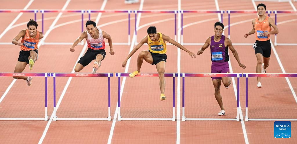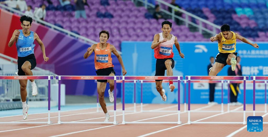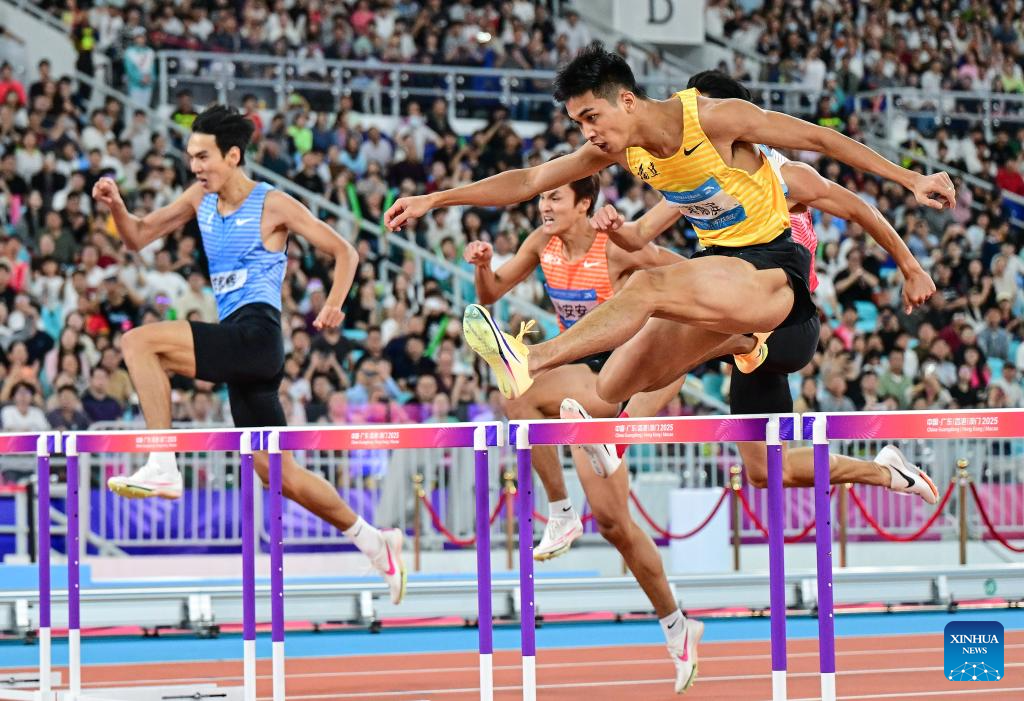 Gong Debin (C) of Fujian competes during the men's 400m hurdles final of athletics in Guangzhou, south China's Guangdong Province, Nov. 17, 2025. (Xinhua/Huang Wei)