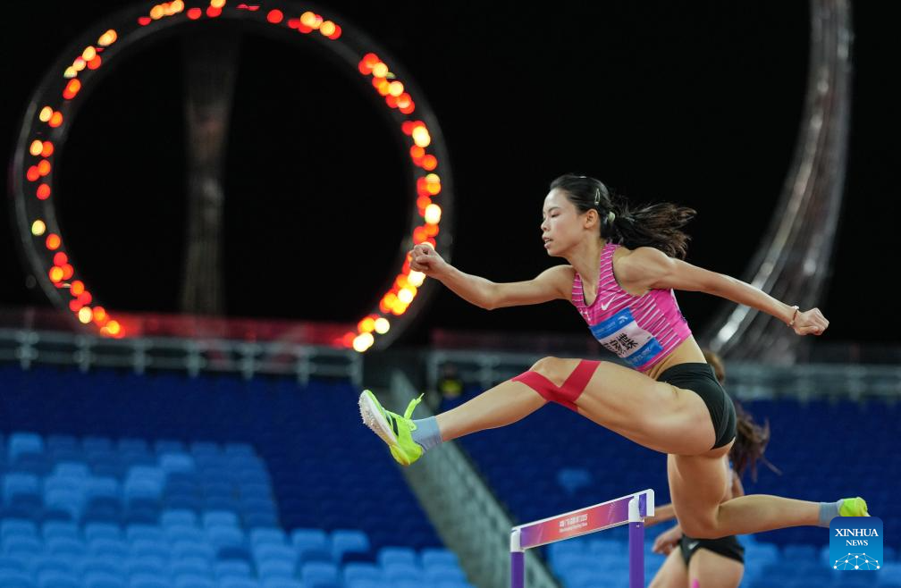Mo Jiadie of Guangdong competes during the women's 400m hurdles final of athletics at China's 15th National Games in Guangzhou, south China's Guangdong Province, Nov. 17, 2025. (Xinhua/Jiang Han)