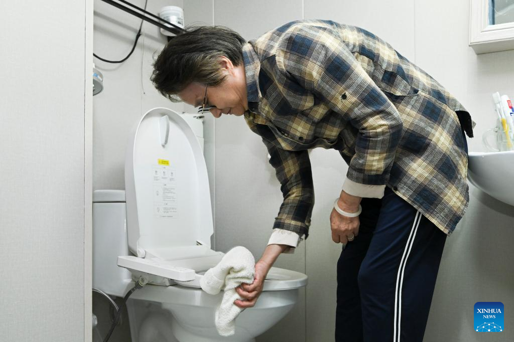 A resident wipes a flush toilet after the toilet renovation project in Yangpu District, east China's Shanghai, Oct. 29, 2025. (Xinhua/Wang Xiang)