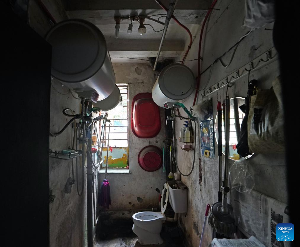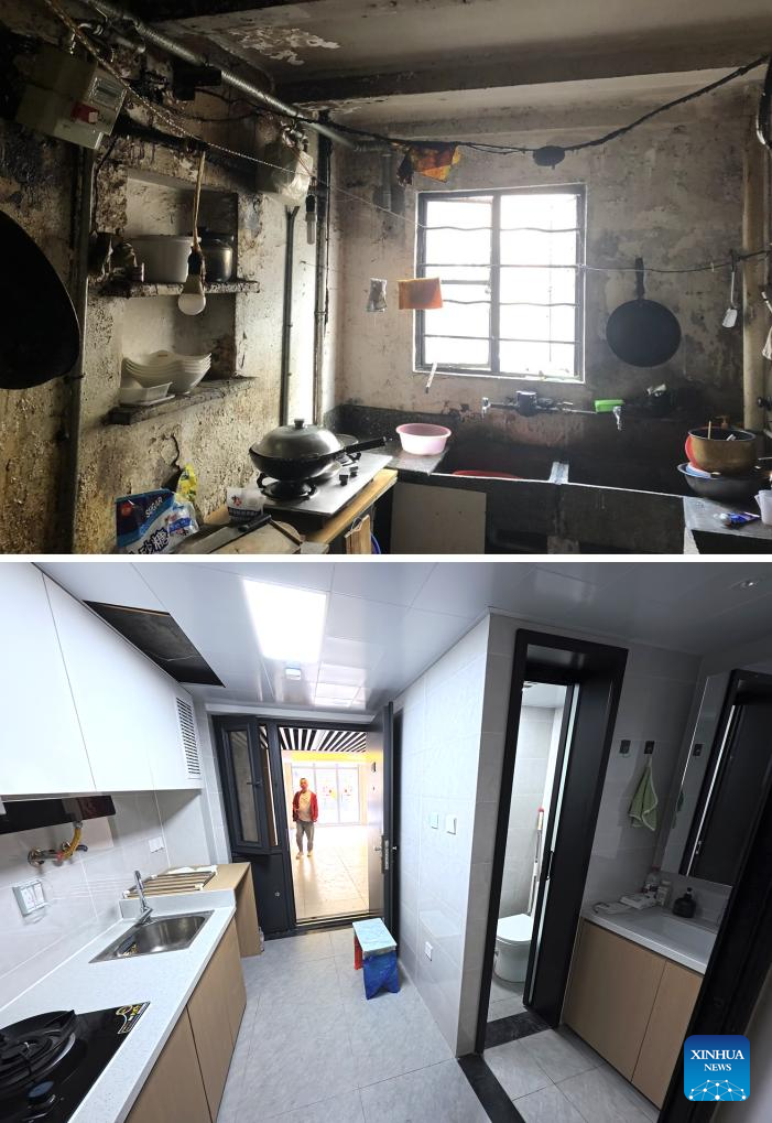 This photo taken on Oct. 29, 2025 shows a toilet (L) and a kitchen after renovation at a household in Yangpu District of east China's Shanghai. Shanghai grappled for decades with a deeply personal challenge for many residents: the humble chamber pot. Cramped living spaces nestled within labyrinthine alleyways transformed even the most basic human needs into a challenging daily struggle. In the early 1990s, per capita living space averaged just 6.6 square meters in Shanghai. This was exacerbated by the architectural design of most the traditional Shikumen residences, which lacked private sanitary facilities. As a result, entire lanes often shared a single public toilet. To improve the overall living conditions for local residents, Shanghai embarked a redevelopment project for old neighborhoods in 1992. Through three decades of hard work, by the end of this September, Shanghai had largely completed its mission to eliminate the last of these "hand-carried toilets," a monumental task targeting the final 14,082 households identified just last year. The decades-long effort to retire the chamber pot tells a story of persistent, fine-grained urban governance in China's most populous city. (Xinhua/Chen Haoming)