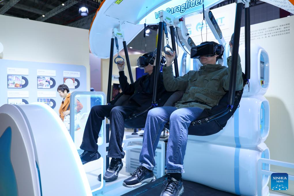 Visitors try VR devices at an exhibition area of Shanghai during the 6th Yangtze River Delta International Cultural Industries Expo in east China's Shanghai, Nov. 20, 2025. Covering an area of 80,000 square meters, the expo kicked off in Shanghai on Thursday, with more than 1,500 exhibitors participating. (Xinhua/Wang Xiang)