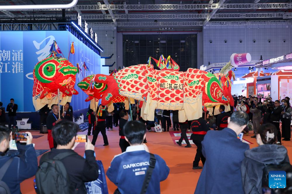 Visitors watch a performance of Zhanqi fish-shaped lanterns at an exhibition area of east China's Anhui Province during the 6th Yangtze River Delta International Cultural Industries Expo in east China's Shanghai, Nov. 20, 2025. Covering an area of 80,000 square meters, the expo kicked off in Shanghai on Thursday, with more than 1,500 exhibitors participating. (Xinhua/Wang Xiang)