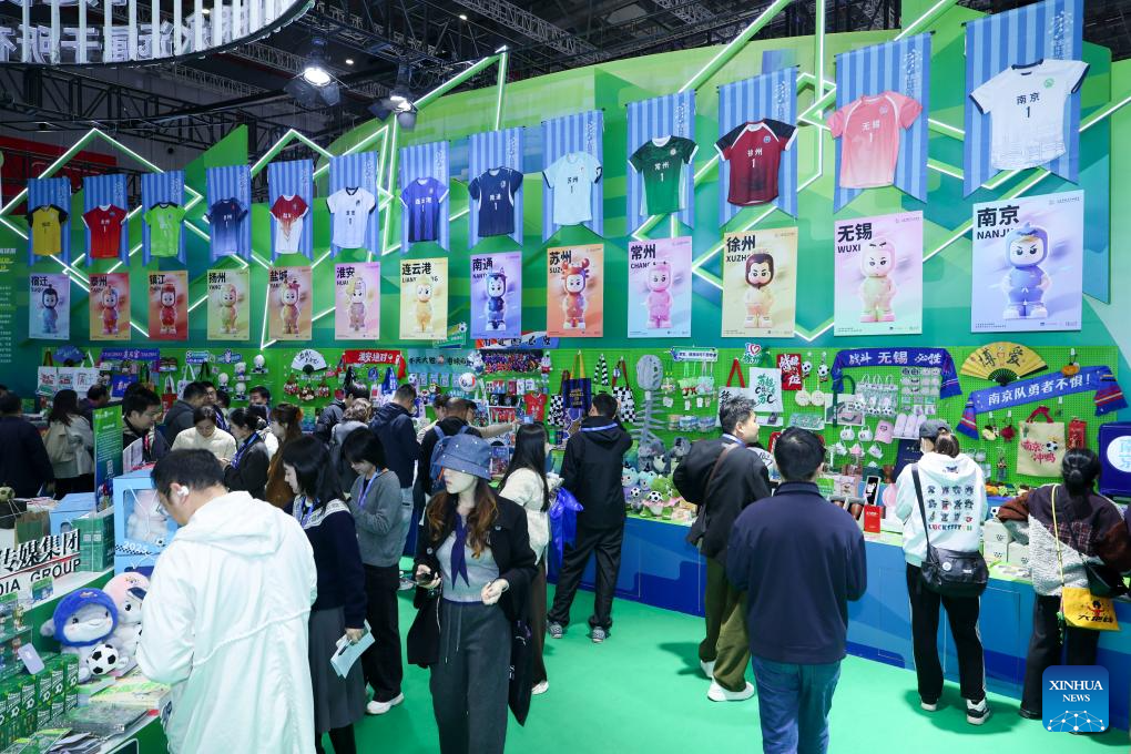 Visitors view cultural and creative products of the Jiangsu Football City League at an exhibition area of east China's Jiangsu Province during the 6th Yangtze River Delta International Cultural Industries Expo in east China's Shanghai, Nov. 20, 2025. Covering an area of 80,000 square meters, the expo kicked off in Shanghai on Thursday, with more than 1,500 exhibitors participating. (Xinhua/Wang Xiang)