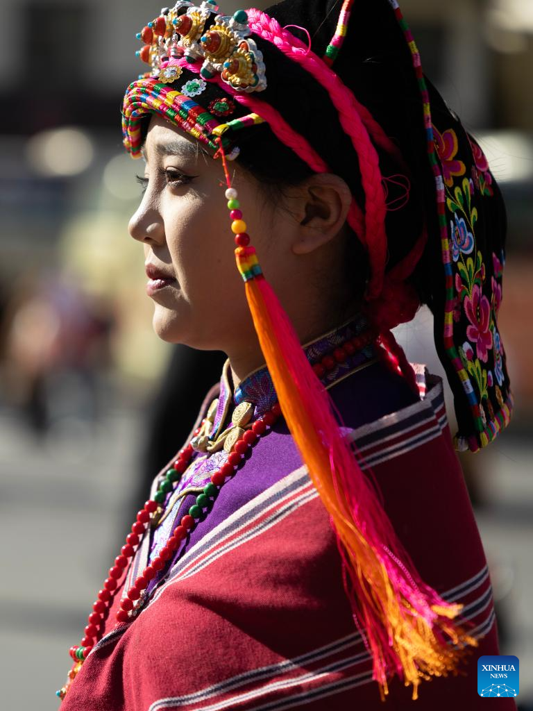 A woman in ethnic attire attends an event celebrating the Qiang New Year in Wenchuan County, Aba Tibetan and Qiang Autonomous Prefecture, southwest China's Sichuan Province, Nov. 19, 2025. An event celebrating the Qiang New Year was held here on Wednesday, starting a series of activities to celebrate the Qiang New Year, which falls on Nov. 20 this year. (Photo by Lan Hongguang/Xinhua)