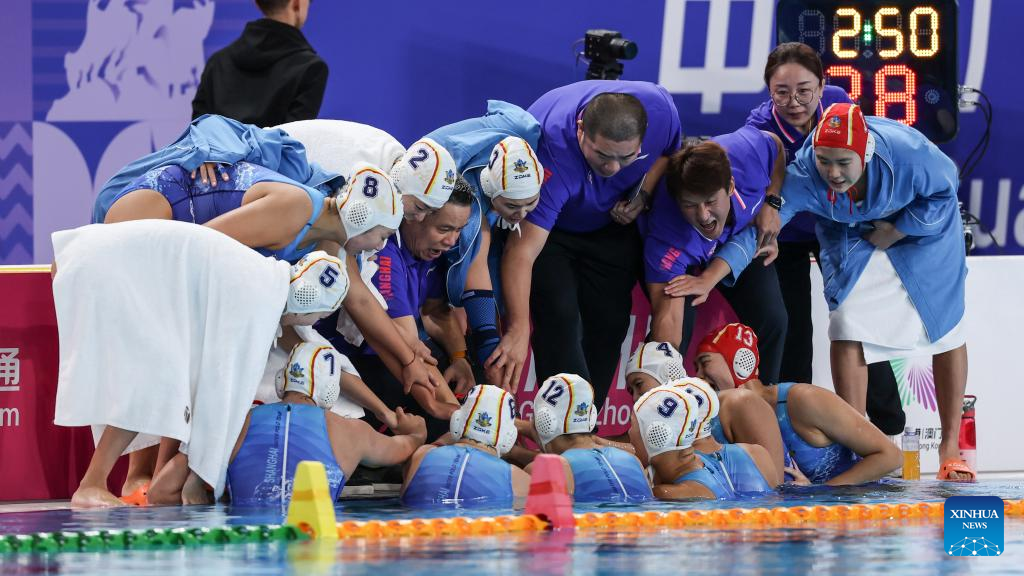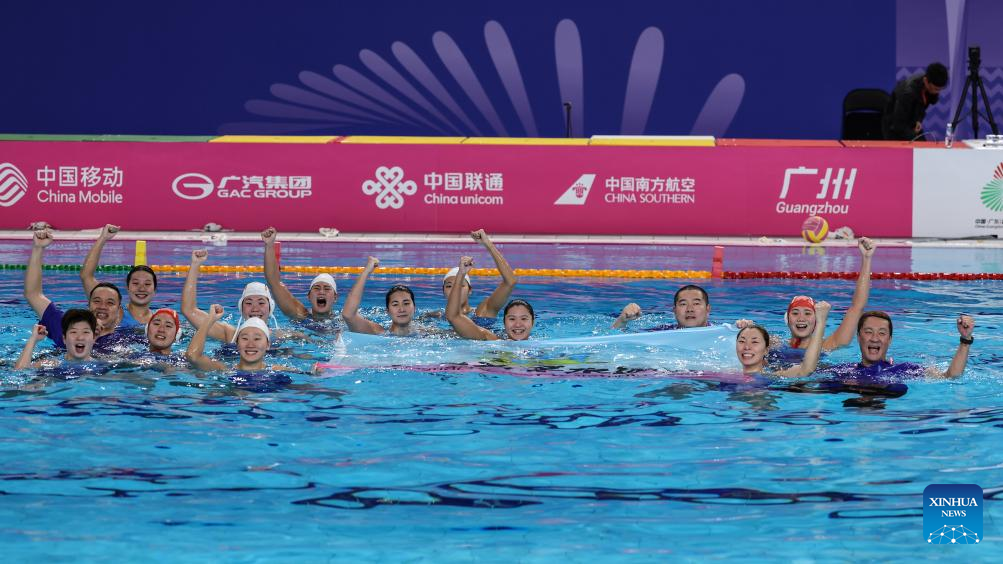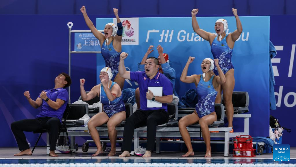 Team members of Shanghai celebrate during the women's water polo final between Shanghai and Tianjin at China's 15th National Games in Guangzhou, south China's Guangdong Province, Nov. 21, 2025. (Xinhua/Pan Yulong)
