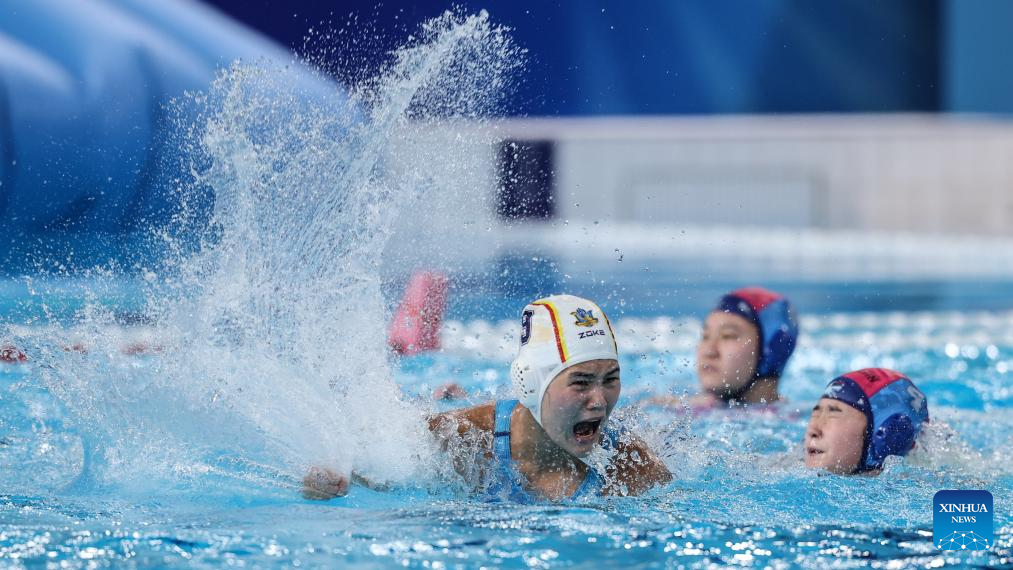 Wang Huan (2nd R) of Shanghai celebrates during the women's water polo final between Shanghai and Tianjin at China's 15th National Games in Guangzhou, south China's Guangdong Province, Nov. 21, 2025. (Xinhua/Pan Yulong)