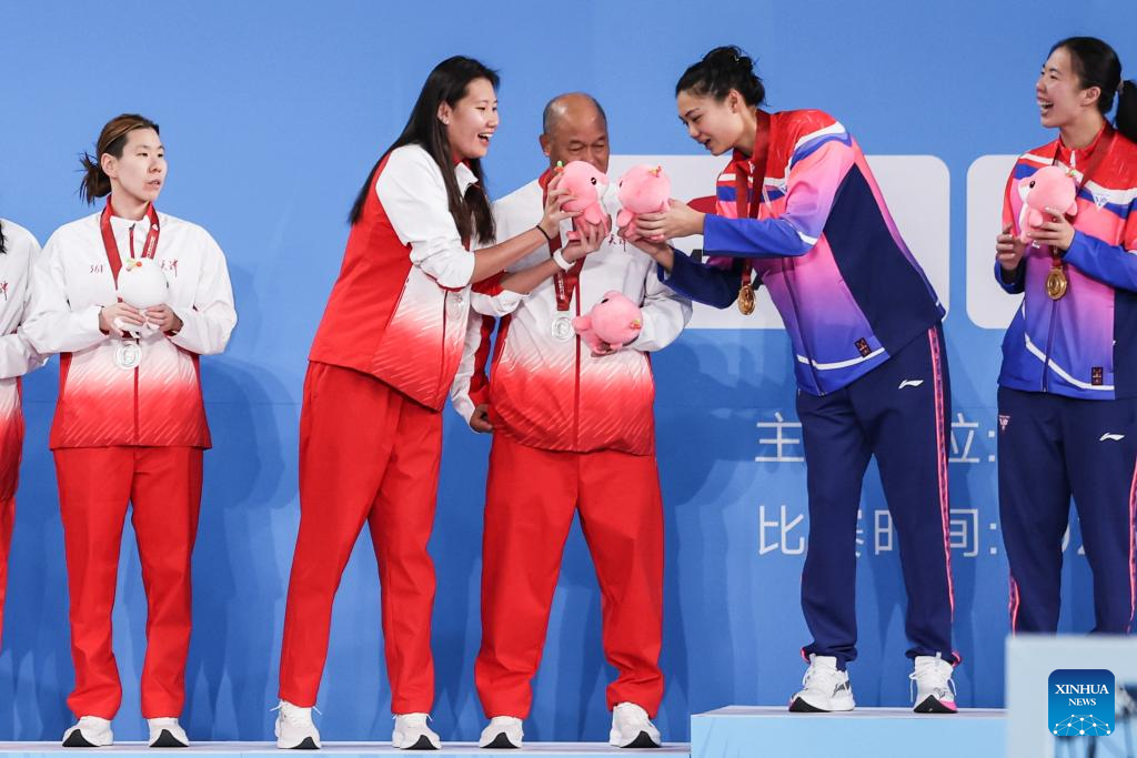 Gold medalist Shen Yineng (2nd R) of Shanghai reacts with silver medalist Du Xinyue (2nd L) of Tianjin during the awarding ceremony for the women's water polo at China's 15th National Games in Guangzhou, south China's Guangdong Province, Nov. 21, 2025. (Xinhua/Pan Yulong)