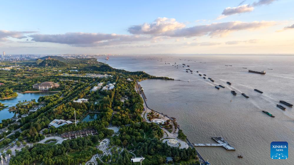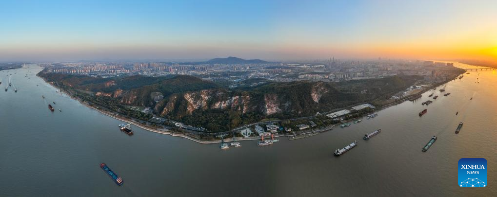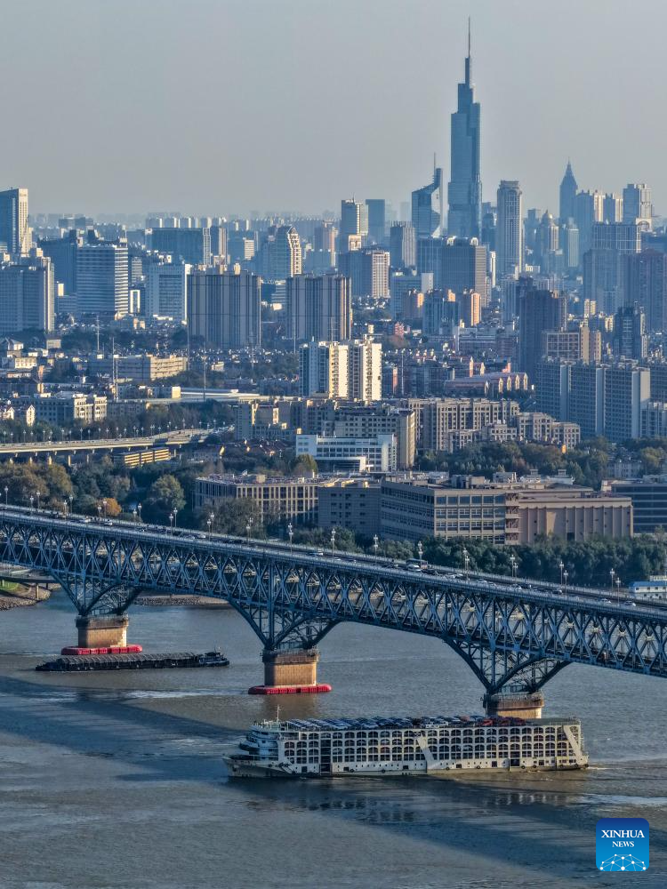 An aerial drone photo shows a panoramic view of vessels sailing along the Yangtze River in Nanjing, east China's Jiangsu Province, Nov. 2, 2023.