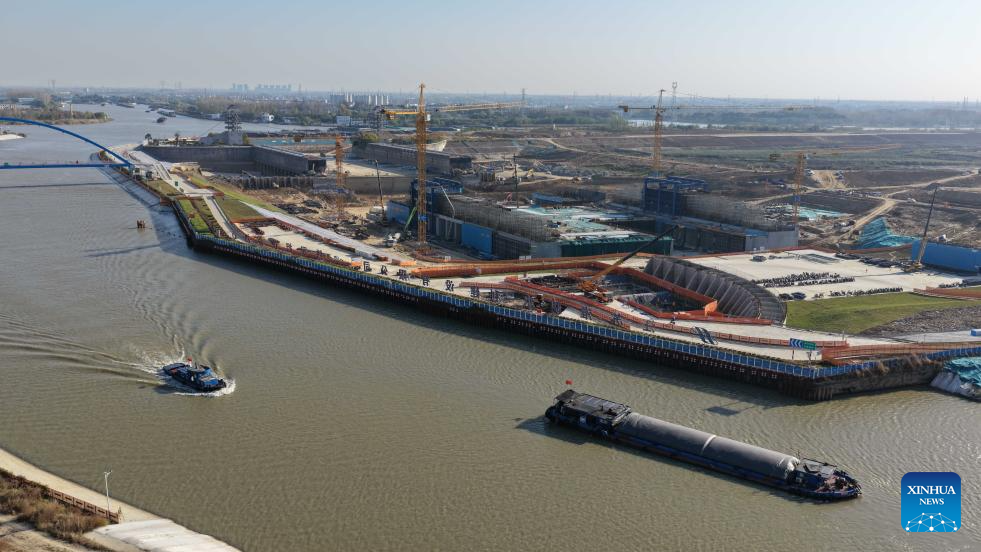 A drone photo shows the construction site of the second phase project of the Huaihe River seaward channel in Huai'an City, east China's Jiangsu Province, Nov. 18, 2025.