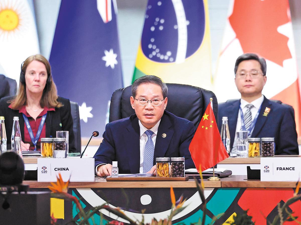 Premier Li Qiang addresses the first session of the 20th G20 Summit, which focuses on inclusive and sustainable economic growth, on Saturday in Johannesburg, South Africa. HUANG JINGWEN / XINHUA