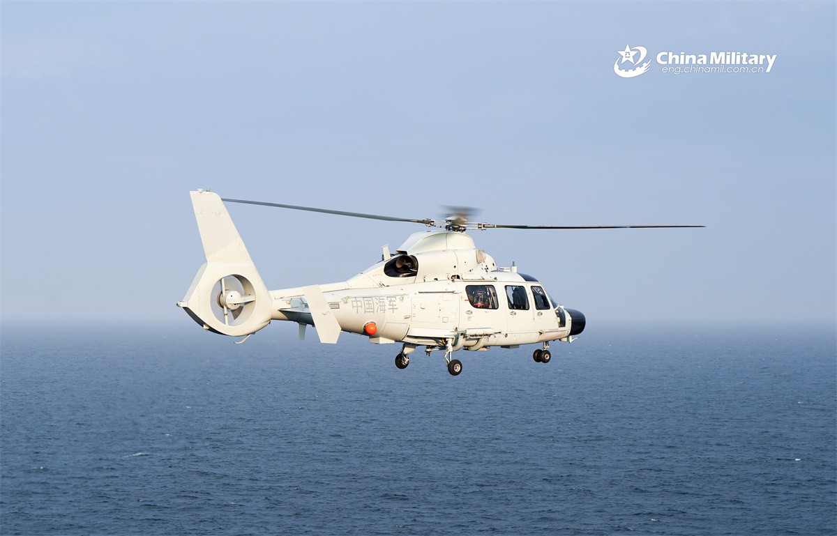 A Z-9D ship-borne helicopter attached to a naval frigate flotilla under the Chinese PLA Eastern Theater Command searches the designated sea area during a take-off and landing training exercise. (eng.chinamil.com.cn/Photo by Tang Haoran)