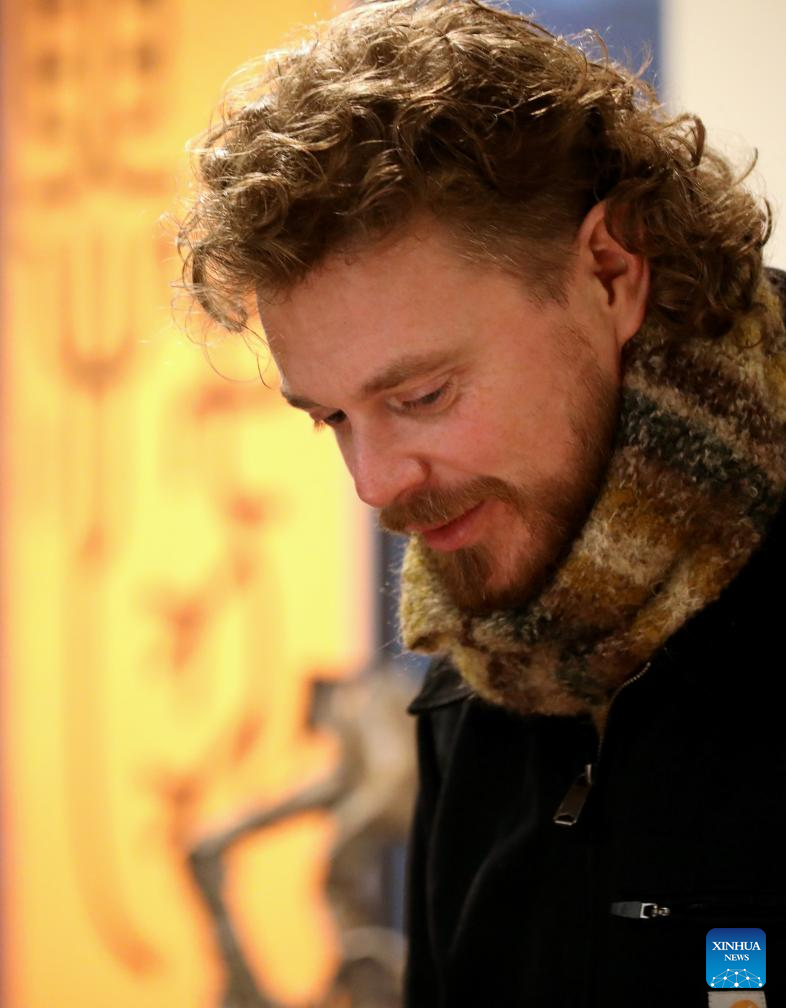 A man visits the exhibition "Hanzi of the West, Letters of the East" in London, Britain, Nov. 22, 2025. (Xinhua/Li Ying)