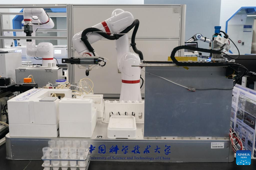Robot Xiaolai performs an experiment at the state key laboratory of precision and intelligent chemistry of the University of Science and Technology of China (USTC) in Hefei, east China's Anhui Province, Nov. 24, 2025. Traditional chemical research has long relied on continuous trial and error by scientists. With the development of artificial intelligence and robotic automation technologies, it has become possible to design experiments and issue instructions through intelligent platforms, using robots to replace human labor in experiential operations, which enhances experimental efficiency and precision.