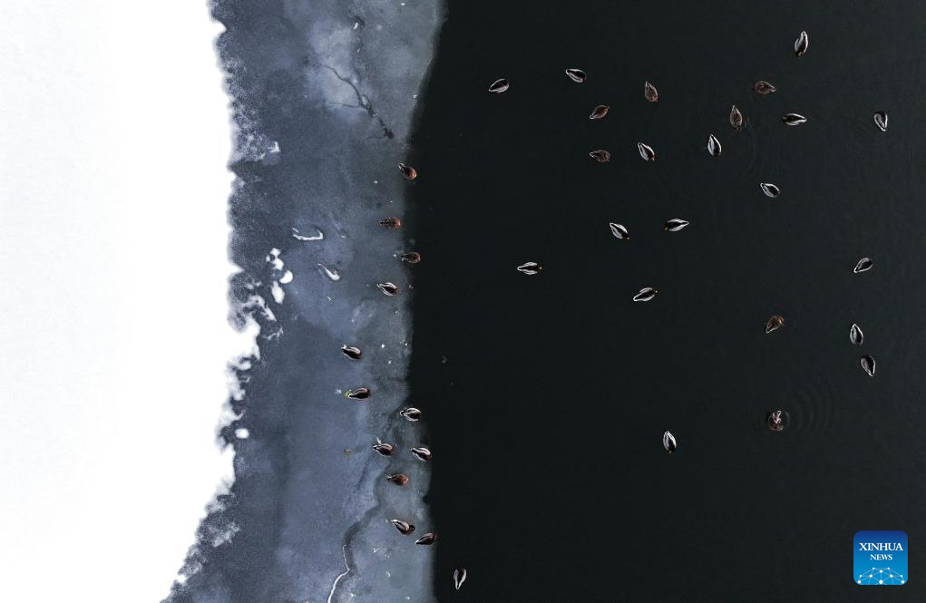 An aerial drone photo taken on Nov. 27, 2025 shows mallards resting on the Harbin section of Songhua River in northeast China's Heilongjiang Province. (Photo by Zhang Shu/Xinhua)