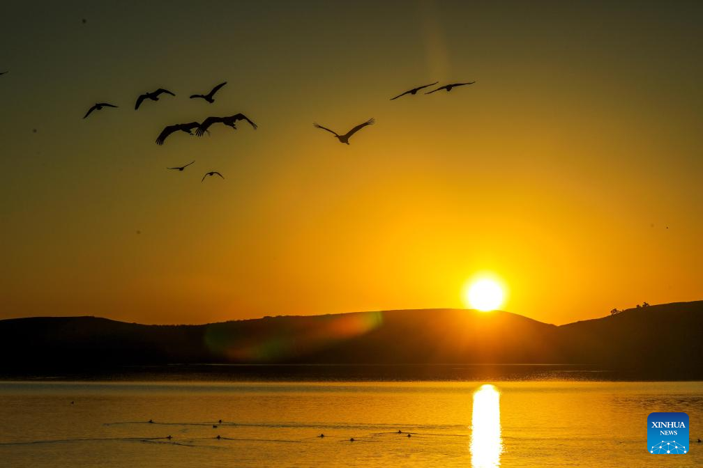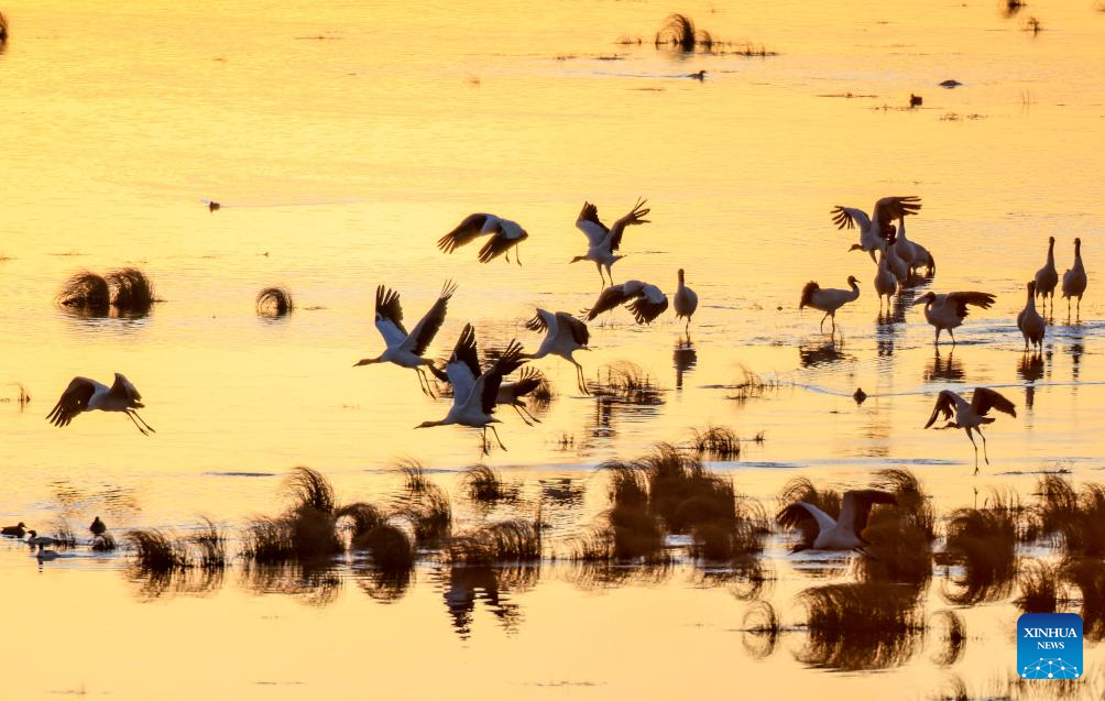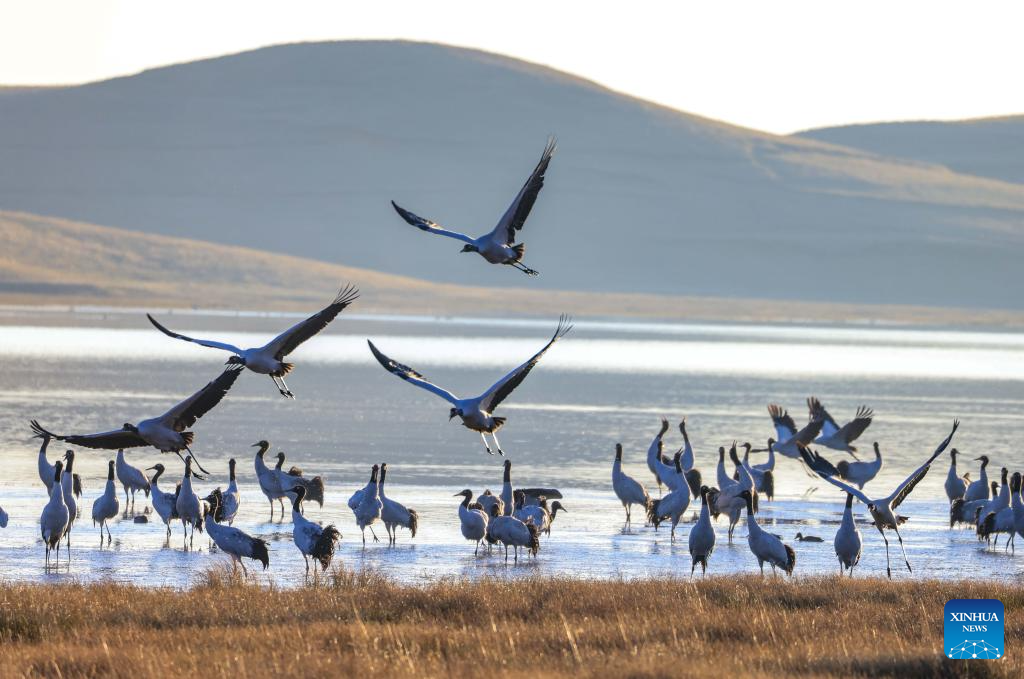 Black-necked cranes fly over a wetland of the Yunnan Dashanbao National Nature Reserve for Black-necked Cranes in Zhaotong City, southwest China's Yunnan Province, on Nov. 30, 2025. Yunnan Dashanbao National Nature Reserve for Black-necked Cranes is a significant wintering habitat and transfer station for migratory black-necked cranes on the Yunnan-Guizhou Plateau. At present, more than a thousand black-necked cranes have flown to the nature reserve to winter here. (Photo by Fan Hui/Xinhua)