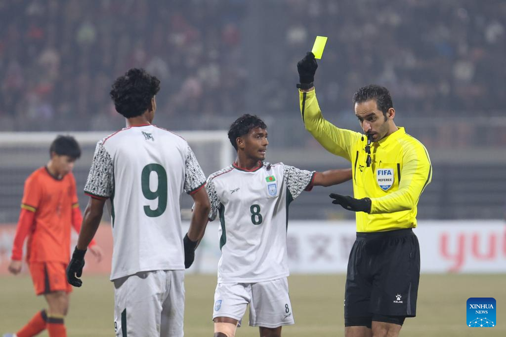 Md Manik (L) of Bangladesh receives a yellow card during the AFC U17 Asian Cup 2026 Qualifier group A match between China and Bangladesh in southwest China's Chongqing Municipality, Nov. 30, 2025. (Xinhua/Huang Wei)
