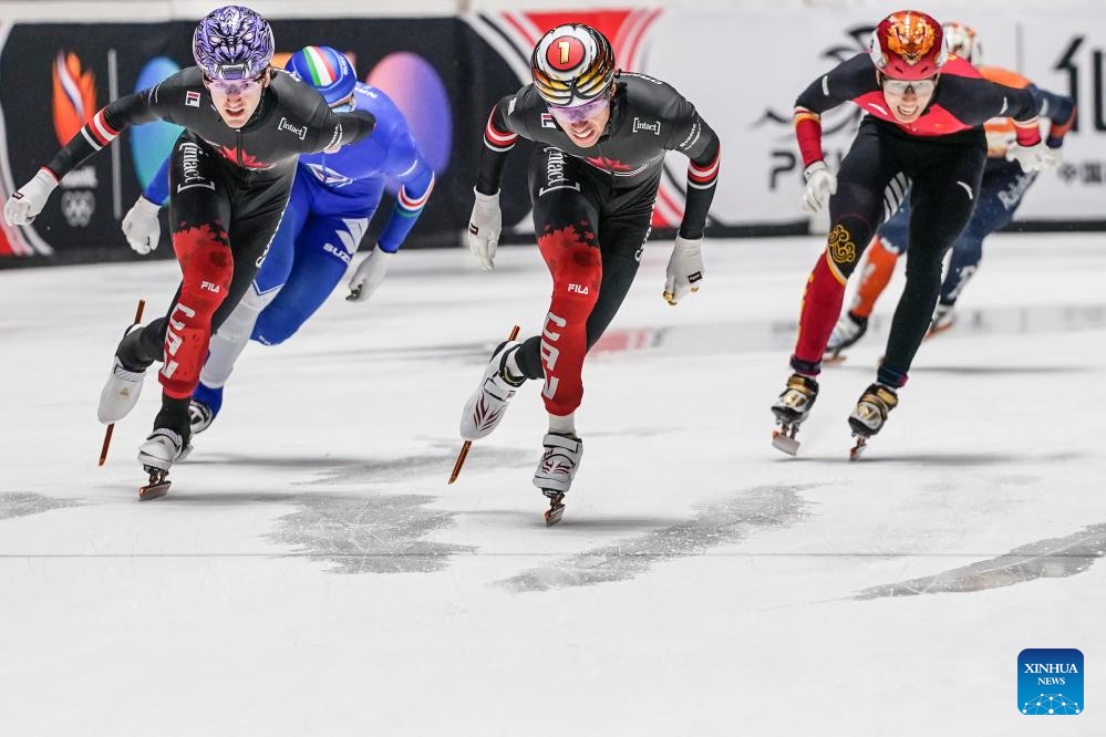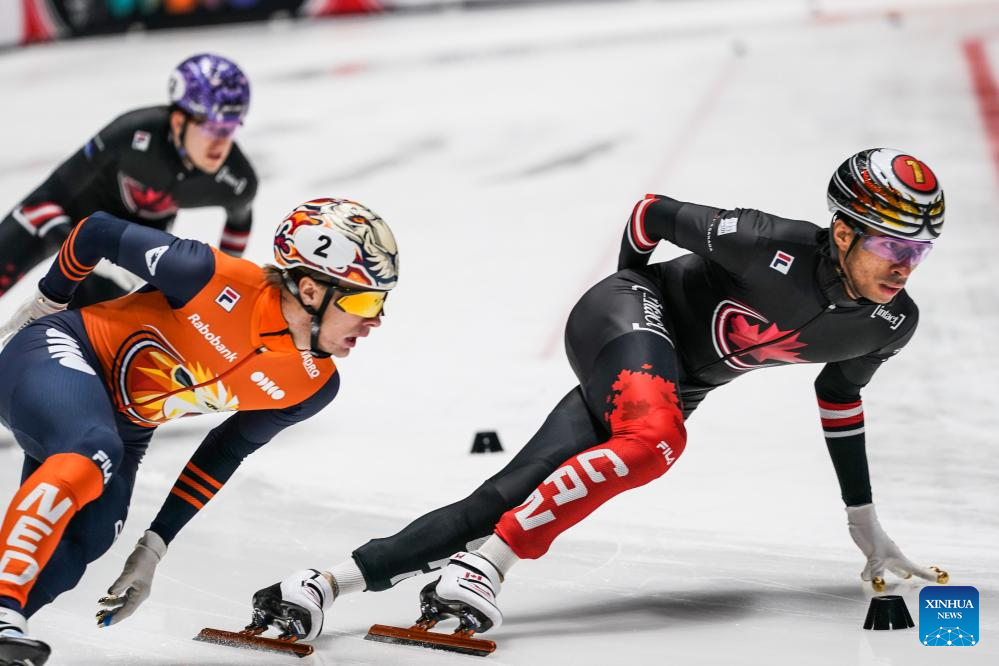 William Dandjinou (front L) of Canada competes during the men's 1500m final at the ISU Short Track World Tour #4 speed skating event in Dordrecht, the Netherlands, Nov. 29, 2025. (Xinhua/Peng Ziyang)