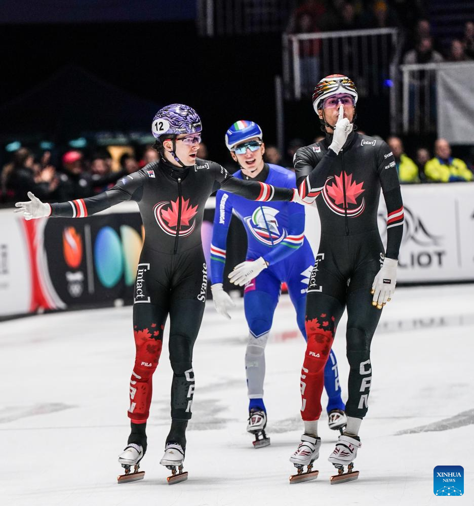 William Dandjinou (R) of Canada celebrates after winning the men's 1500m final at the ISU Short Track World Tour #4 speed skating event in Dordrecht, the Netherlands, Nov. 29, 2025. (Xinhua/Peng Ziyang)