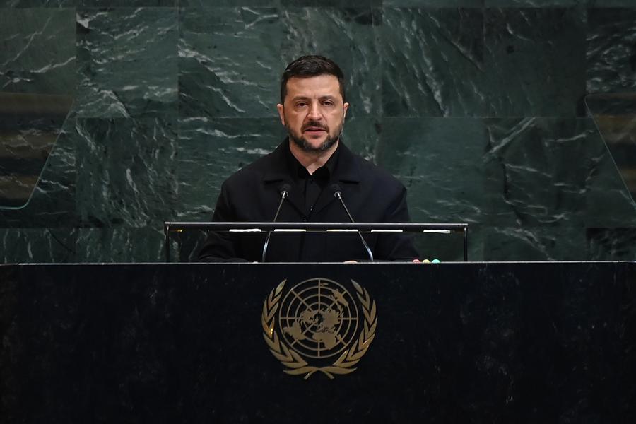 Ukrainian President Volodymyr Zelensky delivers a speech during the General Debate of the 80th session of the United Nations General Assembly (UNGA) at the UN headquarters in New York, Sept. 24, 2025. (Xinhua/Li Rui)