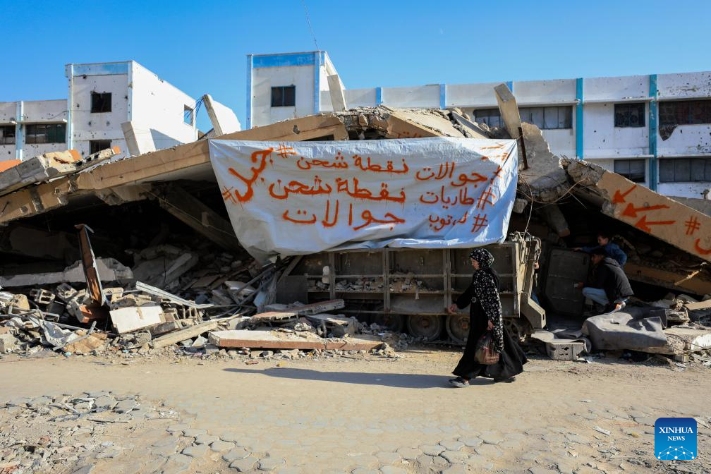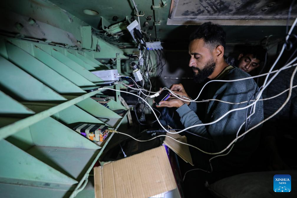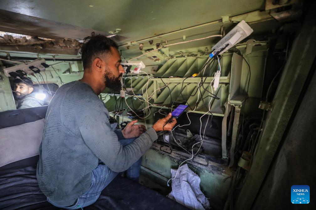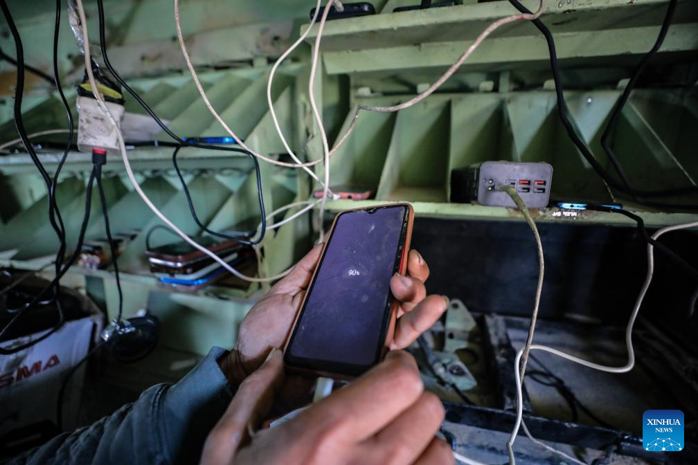 GAZA, Dec. 3 (Xinhua) -- In the rubble of southwestern Gaza City's Tel al-Hawa neighborhood, an abandoned Israeli armored vehicle now serves an unexpected purpose: Draped with a red-cloth sign that reads "Charging Station," it has become a rare source of electricity in an area left in the dark by over two years of conflict.