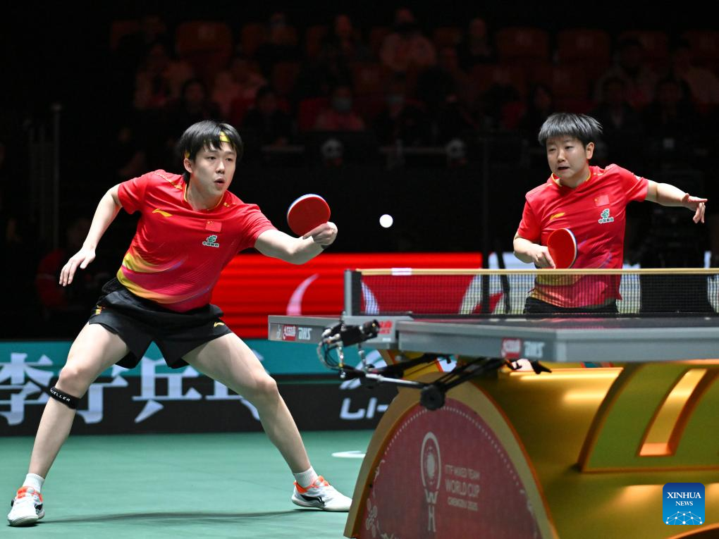 Wang Chuqin (L)/Sun Yingsha of China compete in the mixed doubles match against Alexis Lebrun/Yuan Jia Nan of France during the stage 2 group match between China and France at the ITTF Mixed Team World Cup 2025 in Chengdu, southwest China's Sichuan Province, Dec. 4, 2025. (Xinhua/Xu Bingjie)