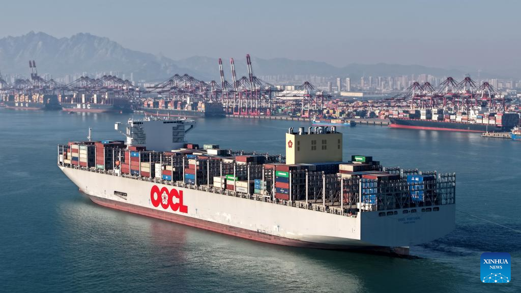 A drone photo taken on Dec. 4, 2025 shows a cargo ship loaded with containers departing from the Qianwan Container Terminal of Qingdao Port in east China's Shandong Province. With nearly 240 foreign trade routes, Qingdao Port connects over 700 ports in more than 180 countries and regions worldwide. (Xinhua/Li Ziheng)