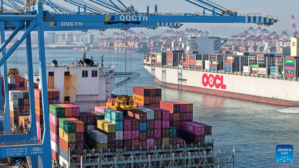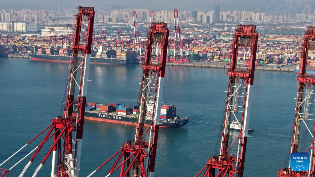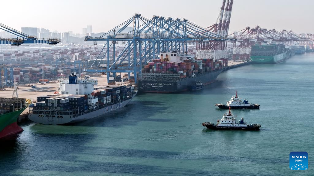 A drone photo taken on Dec. 4, 2025 shows cargo ships loading and unloading containers at the Qianwan Container Terminal of Qingdao Port in east China's Shandong Province. With nearly 240 foreign trade routes, Qingdao Port connects over 700 ports in more than 180 countries and regions worldwide. (Xinhua/Li Ziheng)