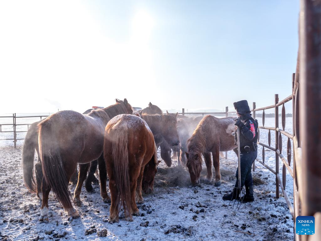 A policeman of the "Gyrfalcon" mounted police team feeds horses inside a pen on snow-covered Chenbarhu Banner Grassland in Hulun Buir, north China's Inner Mongolia Autonomous Region, Dec. 2, 2025.(Xinhua/Ma Jinrui)