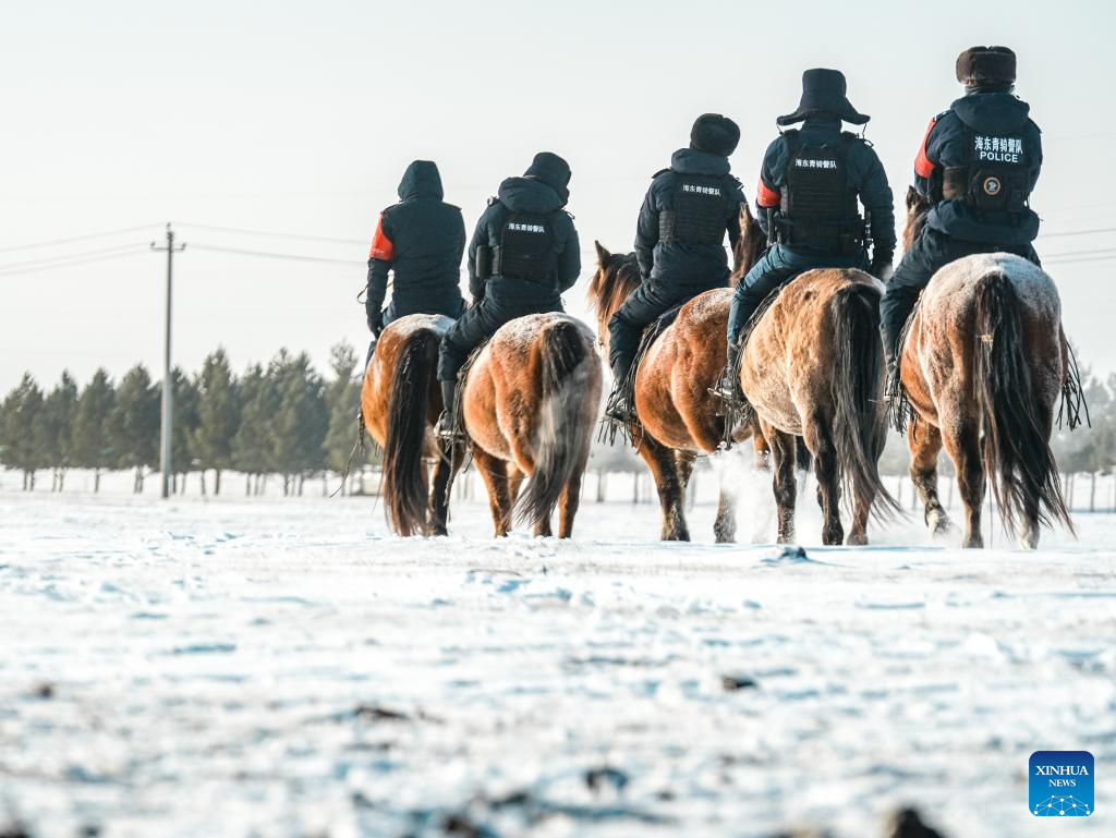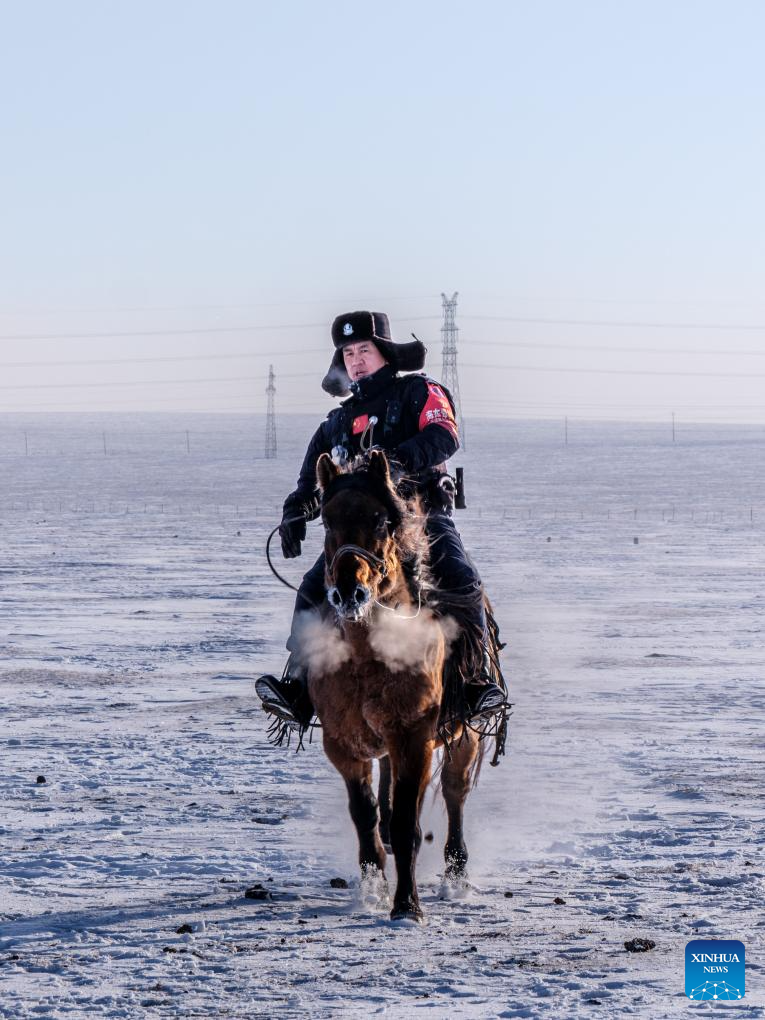 Policemen of the "Gyrfalcon" mounted police team patrol on snow-covered Chenbarhu Banner Grassland in Hulun Buir, north China's Inner Mongolia Autonomous Region, Dec. 2, 2025. (Xinhua/Darhan)