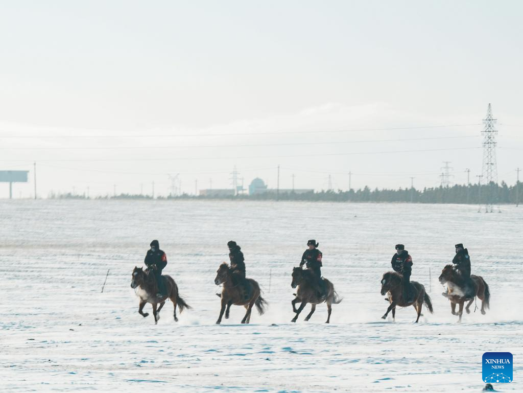 Policemen of the "Gyrfalcon" mounted police team conduct training activities on snow-covered Chenbarhu Banner Grassland in Hulun Buir, north China's Inner Mongolia Autonomous Region, Dec. 2, 2025. (Xinhua/Darhan)