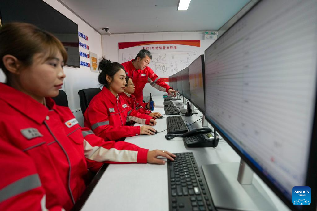 Technicians check the operating parameters of the oil and gas processing equipment at a national-level demonstration zone of continental shale oil of Daqing Oilfield in Daqing, northeast China's Heilongjiang Province, Dec. 4, 2025. Daqing Oilfield, one of China's largest energy production bases, announced Friday that the yearly output of the shale oil in the demonstration zone has exceeded one million tonnes. (Xinhua/Wang Song)